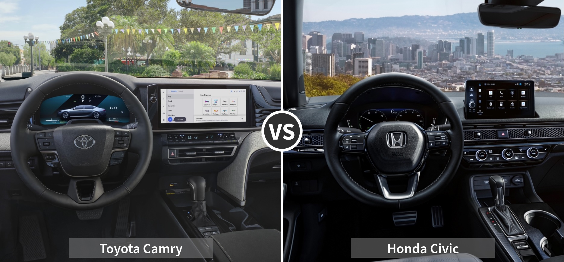 Looking inside the Toyota Camry and Honda Civic, the entry-level trims come with cloth seats, and leather seating is available in the higher-end trims. Heated seats are also available on the upper trims. Wireless charging and a push-button start are standard on the Camry, but only available on certain trims of the Civic. For those who want an elevated ride, both vehicles offer available ambient lighting and a moonroof. Overall, the Camry’s interior looks more refined, while the Civic opts for a sportier look.